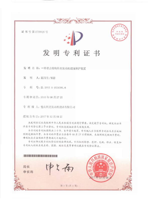 ZL 201510534381.6-An engine overspeed protection device with force arm member-Certificate.